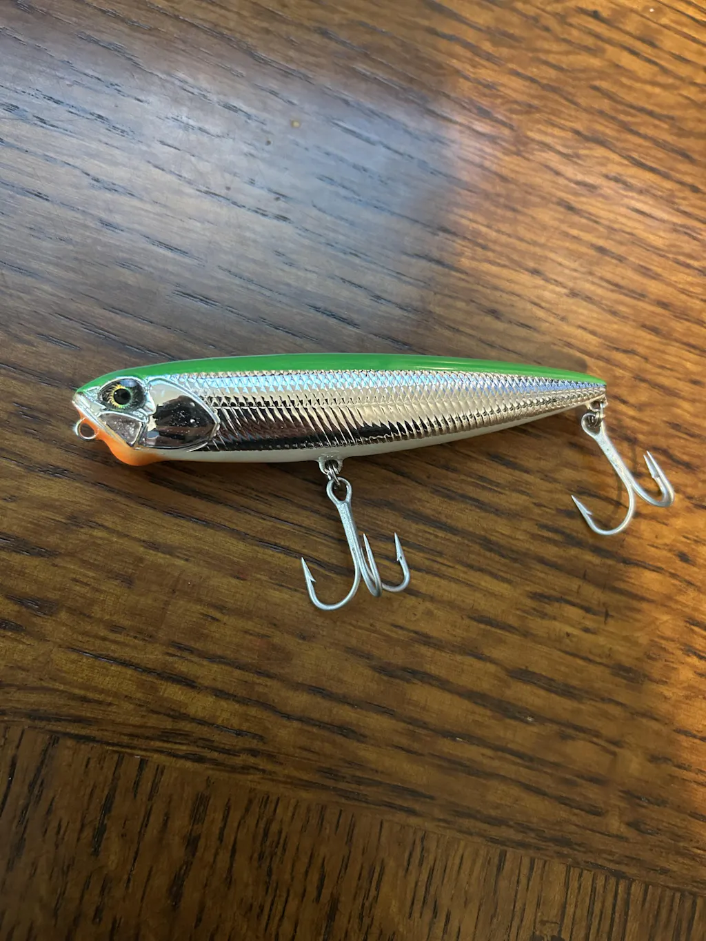 I am very happy with this lure, it has a brilliant mirror like finish and a very loud free knocking rattle. It rattles with back and forth and side to side movements. It walks the dog nicely and rests at a near vertical position. It pairs well with #2 or #4 treble hooks. I was able to use 7mm round eyes that I trimmed down with a razor blade.