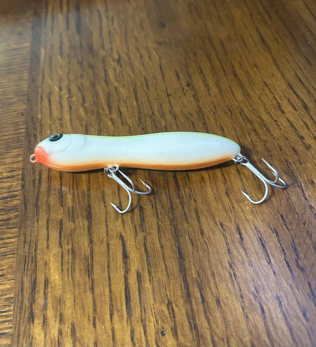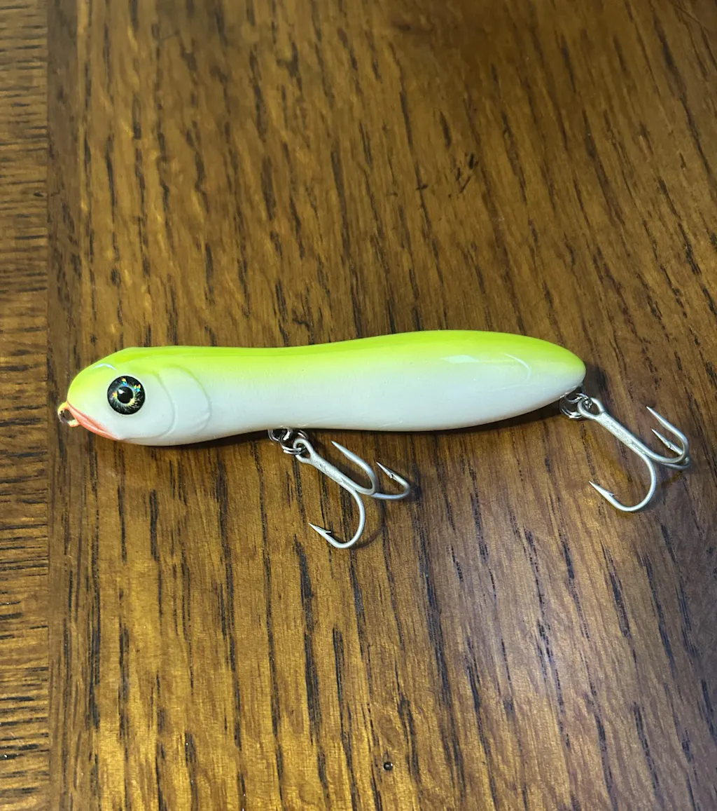 This is a great bait, it has a very loud single knocker in the back and a small rattle in the front section. It is one of the loudest smaller profile topwater lures I have seen. It is almost 4" long and pairs well with #2 or #4 treble hooks and it floats at about a 45 degree angle.